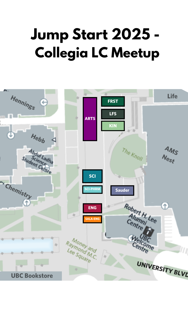 The button below takes you to maps.ubc.ca, the UBC Wayfinding website for navigating campus. In the upper left corner of the website, you can search your Learning Community’s name (e.g. LFS 02CA) to find your meet-up location.